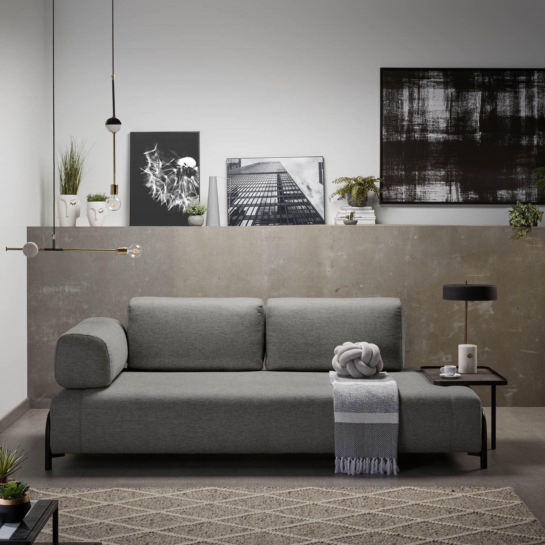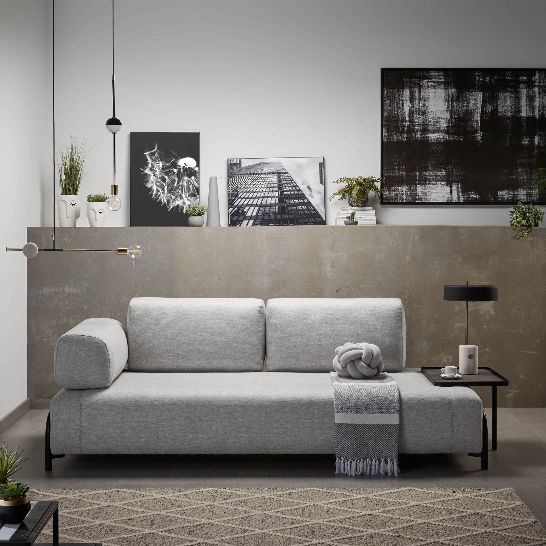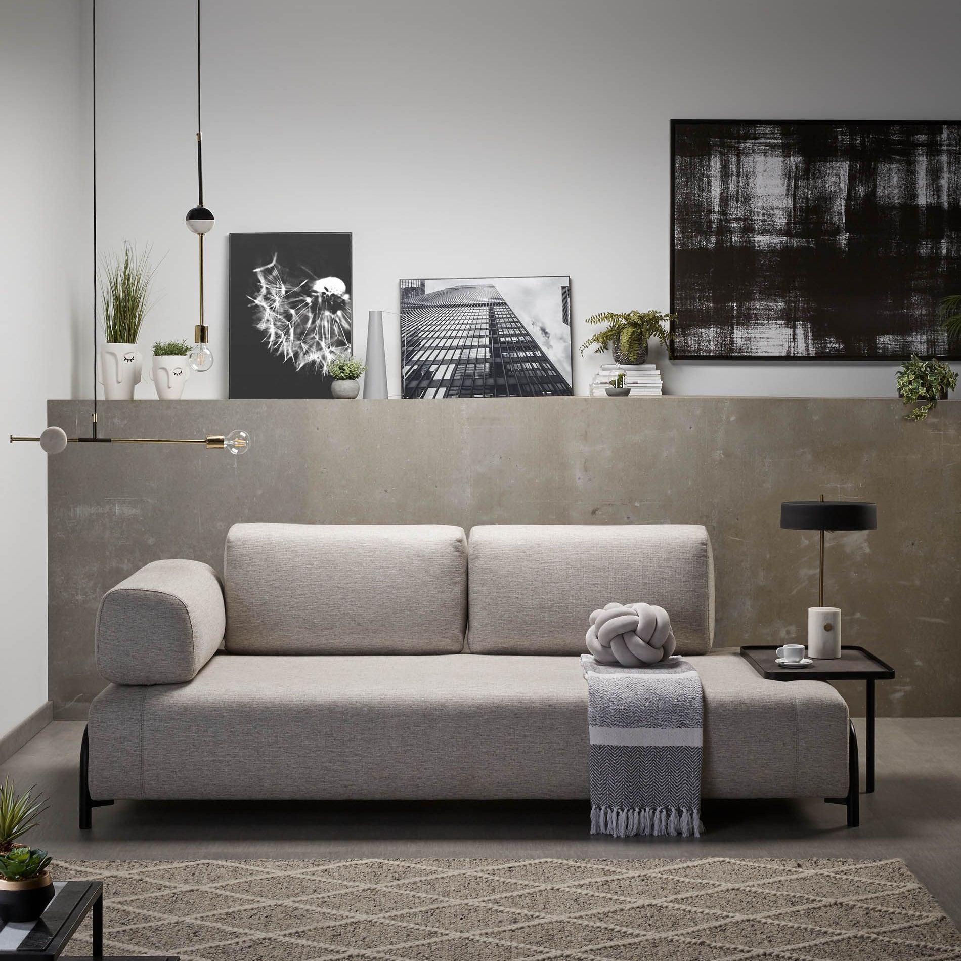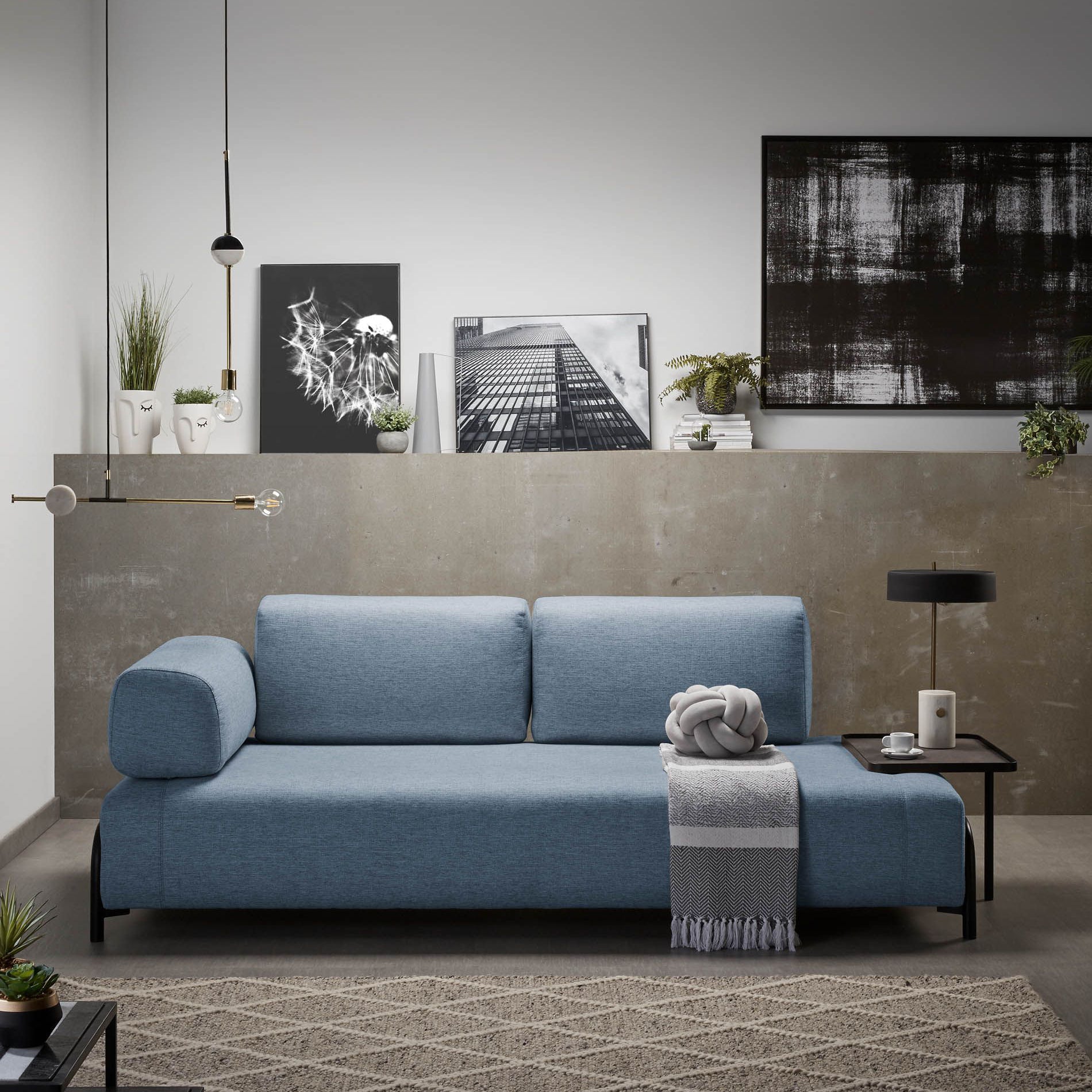 De bank Compo is een ontwerp van Òscar Doll, één van de ontwerpers van het KaveHome-team. Het is een tijdloos stuk met een essentiële basisvorm. Dankzij de verschillende accessoires past de bank in alle omgevingen. De structuur van dennenhout is bedekt met schuim en bekleed met blauw stof. Een veelzijdige bank met verschillende gedaanten die altijd de aandacht trekt. Just relax and enjoy it.